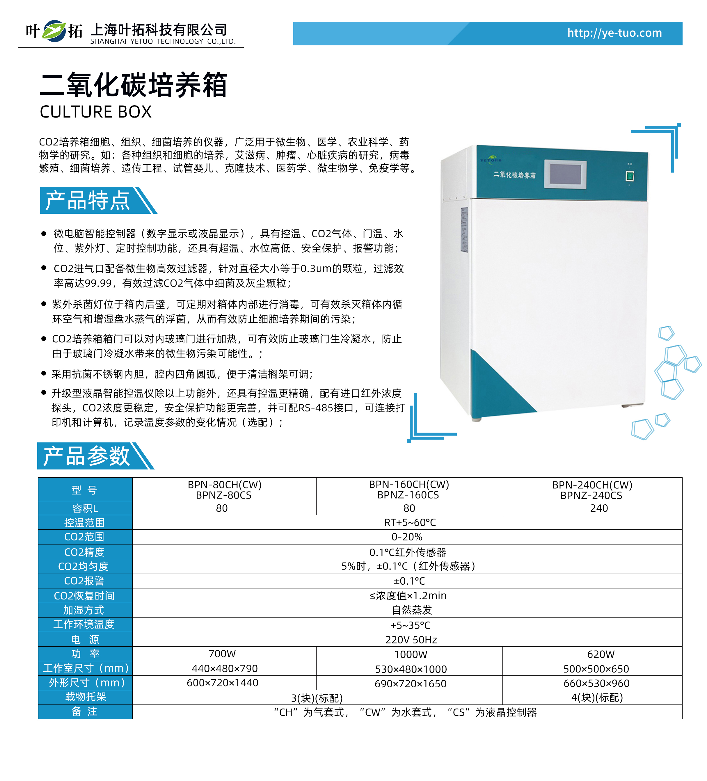 ●微電腦智能控制器(數字顯示或液晶顯示),具有控溫、CO2氣體、門溫、水位、紫外燈、定時控制功能,還具有超溫、水位高低、安全保護、報警功能;